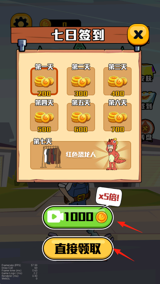 1、游戲設(shè)有“七日簽到”活動,每日可領(lǐng)取金幣獎勵以此類推,可點(diǎn)擊“直接領(lǐng)取”獲取當(dāng)日獎勵,或點(diǎn)擊帶有播放標(biāo)識的按鈕觀看廣告獲取5倍獎勵(1000金幣)。