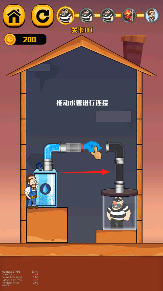2、在關(guān)卡界面如關(guān)卡01,按照“拖動水管進(jìn)行連接”的提示,通過拖動水管部件將其正確連接,完成關(guān)卡目標(biāo),屏幕上方顯示當(dāng)前金幣數(shù)量(如200)。