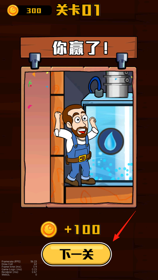 3、成功完成關(guān)卡顯示“你贏了!后,可獲得金幣獎勵(如+100金幣),點(diǎn)擊“下一關(guān)”按鈕進(jìn)入下一關(guān)挑戰(zhàn),繼續(xù)推進(jìn)游戲進(jìn)程。