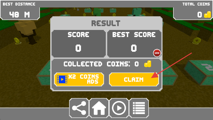 3、結(jié)束后,點(diǎn)擊【CLAIM】按鈕領(lǐng)取獎(jiǎng)勵(lì),可查看得分、最佳距離等信息,準(zhǔn)備重新開始游戲。