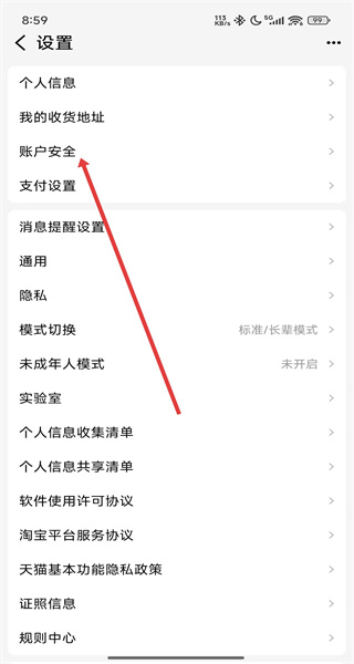 1、在設(shè)置頁面點擊賬戶安全選項,進入賬戶安全設(shè)置界面。