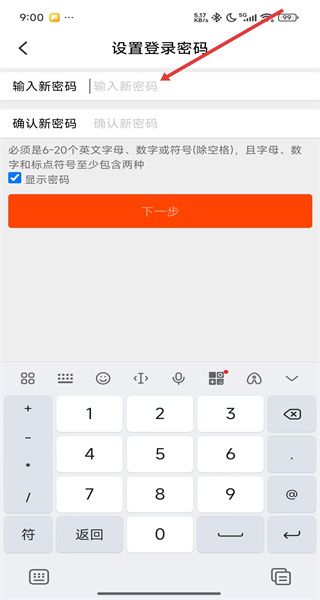 4、輸入收到的驗證碼后,進入設(shè)置登錄密碼頁面,在輸入新密碼欄填寫符合要求的新密碼。