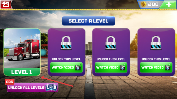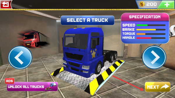 2、在卡車選擇界面,選擇藍色卡車后,點擊箭頭所指的【NEXT】按鈕,進入關(guān)卡選擇界面。