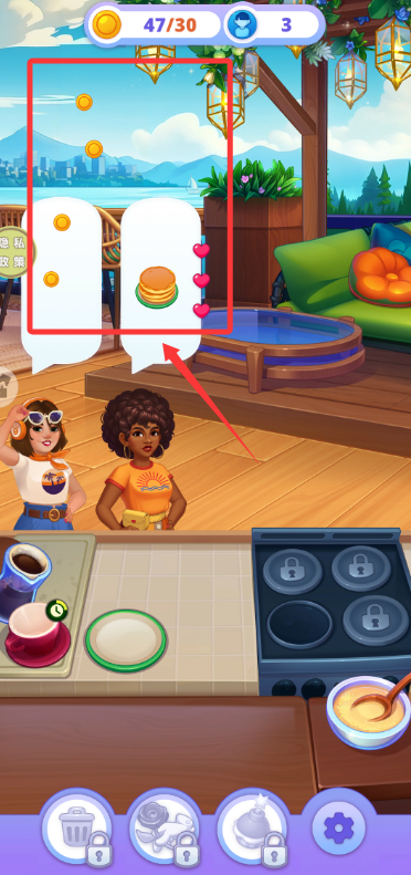 3、通過累積獎勵金幣可解鎖新廚具與裝飾,逐步升級餐廳設施。