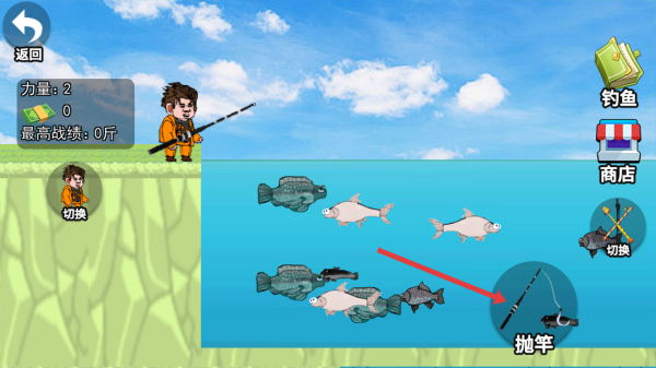 2、在釣魚場(chǎng)景,按箭頭指示點(diǎn)擊“拋竿”按鈕,進(jìn)行釣魚操作。