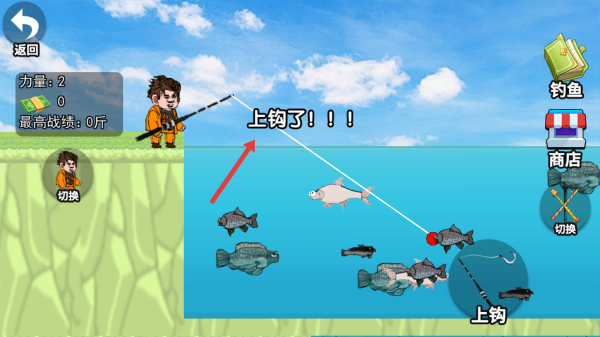 3、當(dāng)魚上鉤后,按箭頭指示點(diǎn)擊“上鉤”按鈕,釣起魚。