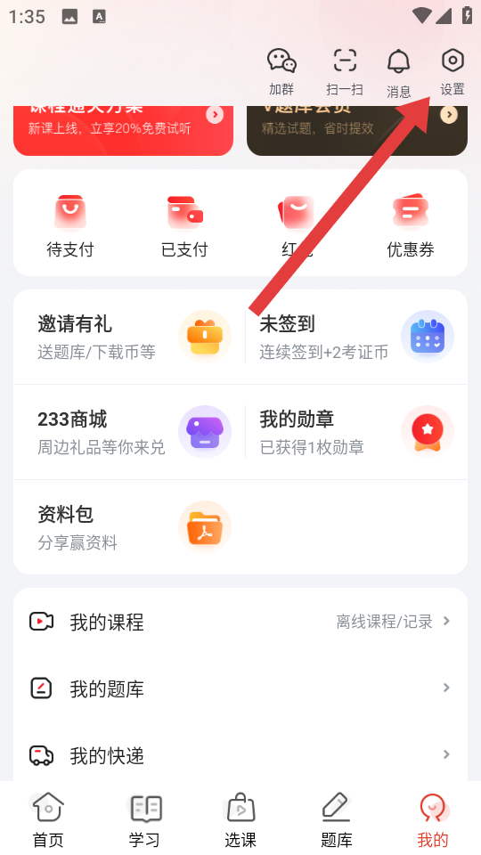 1、在233網(wǎng)校我的頁(yè)面,點(diǎn)擊右上角的設(shè)置圖標(biāo),進(jìn)入設(shè)置界面。
