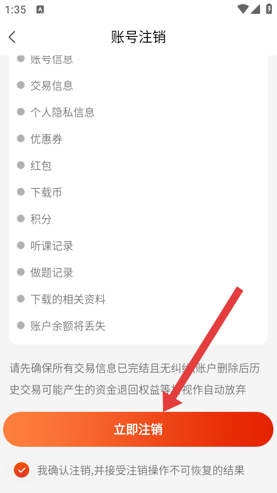 3、在賬號(hào)注銷(xiāo)頁(yè)面,需要勾選我確認(rèn)注銷(xiāo)...,然后點(diǎn)擊立即注銷(xiāo)按鈕。