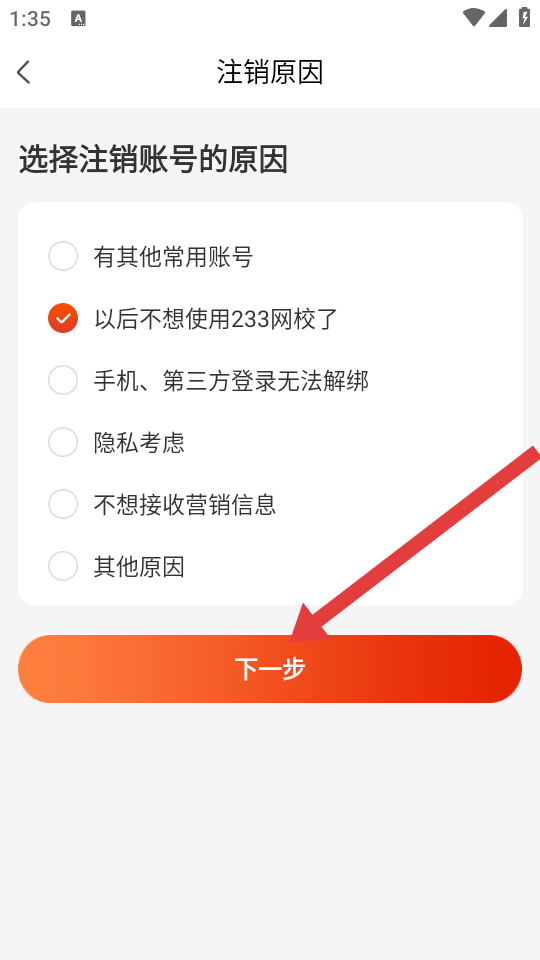 4、在注銷(xiāo)原因頁(yè)面,選擇注銷(xiāo)賬號(hào)的原因,點(diǎn)擊下一步按鈕完成注銷(xiāo)流程。