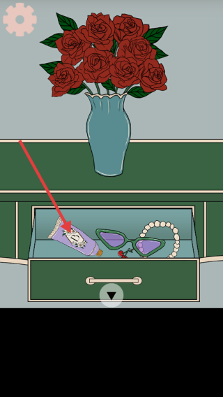 3、抽屜打開后,顯示有護手霜、眼鏡、珍珠等物品,箭頭指向護手霜,用于推進解謎流程。