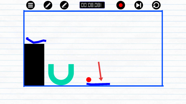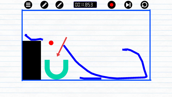 2、在第二關(guān),繪制藍(lán)色線條,讓小球避開(kāi)障礙,落入指定區(qū)域,完成路徑搭建。