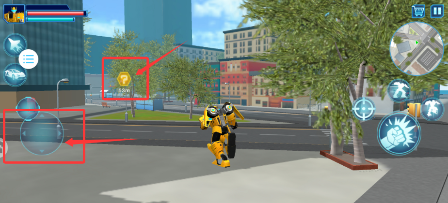 1、啟動(dòng)游戲后,通過(guò)虛擬搖桿控制機(jī)器人移動(dòng),前往地圖標(biāo)記處接取戰(zhàn)斗任務(wù)。