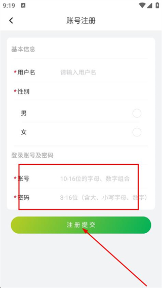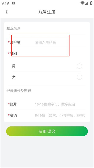 3、進入注冊頁面,在注冊頁面填寫用戶名以及選擇性別。