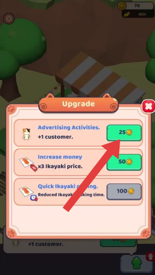 1、呈現(xiàn)了AdvertisingActivities、Increasemoney(提升收益,花費(fèi)50金幣可使章魚燒價(jià)格×3)QuickIkayakimaking三種升級選項(xiàng),用于玩家提升店鋪經(jīng)營能力。