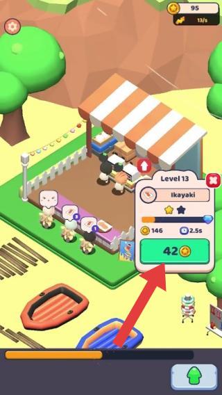 2、呈現(xiàn)的是章魚燒攤位(Ikayaki)的升級界面,當(dāng)前為13級,顯示制作時(shí)間2.5秒、收益146,花費(fèi)42金幣可進(jìn)行升級,用于玩家提升攤位經(jīng)營能力。