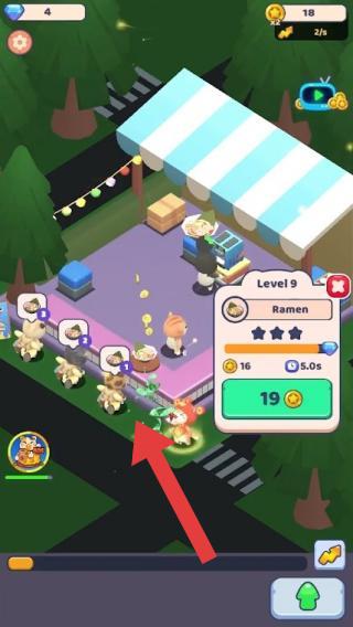 3、呈現(xiàn)拉面攤位(Ramen)經(jīng)營場景,當(dāng)前攤位等級9級,制作時(shí)間3.0秒、收益16,花費(fèi)19金幣可升級,用于玩家提升拉面攤位經(jīng)營能力,推動(dòng)壽司店整體發(fā)展。