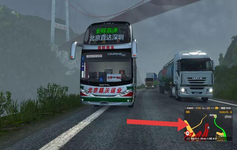 3、觀察右下角導(dǎo)航界面,依據(jù)路線指引避讓前方車輛,按照導(dǎo)航規(guī)劃的路徑駕駛巴士前行。
