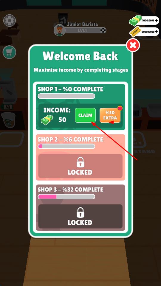 2、用收益升級(jí)店鋪設(shè)施,解鎖拿鐵、摩卡等進(jìn)階配方,派遣咖啡師參加烘焙課程提升拉花技能,縮短顧客等待時(shí)間。