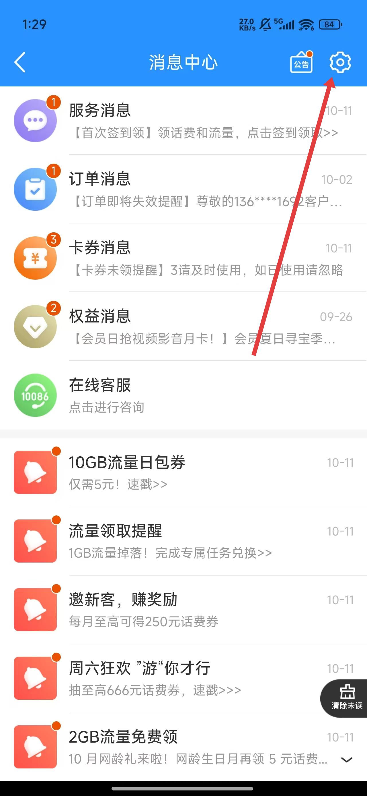 3、在進入到消息中心頁面,可以點擊右上角齒輪圖標,進行設(shè)置操作。
