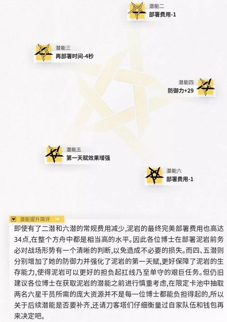 1、潛能提升:泥巖潛能二、六減部署費用,三減再部署時間,四加防御,五強化天賦,雖提升生存與部署靈活度,但抽取成本高,建議權(quán)衡隊伍資源再決定。