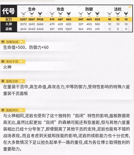 3、干員面板評析:泥巖為六星重裝,生命、攻擊較高,防御中等,信賴加生命與防御,類似火神,受“自閉”特性影響,脫離支援仍有續(xù)航,可擔(dān)單線重任。
