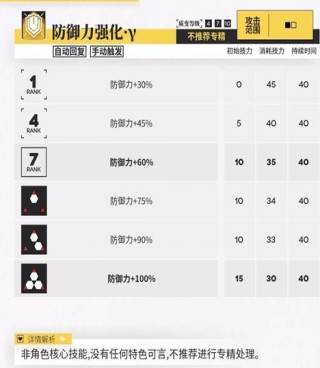 1、技能機制:「防御強化·γ」自動回復(fù),提升防御(1級+30%,7級+60%,專精后最高+100%),無獨特機制。