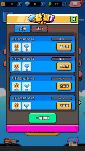3、通過懸賞任務(wù)界面查看關(guān)卡挑戰(zhàn),完成指定章節(jié)波次可獲得金幣鉆石獎(jiǎng)勵(lì),一鍵領(lǐng)取所有已完成任務(wù)獎(jiǎng)勵(lì)。