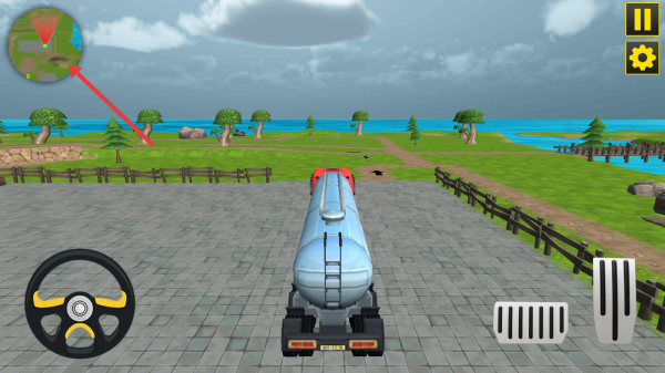 3、駕駛油罐車,參考左上角小地圖,沿路線行駛,避障礙,完成運(yùn)輸。