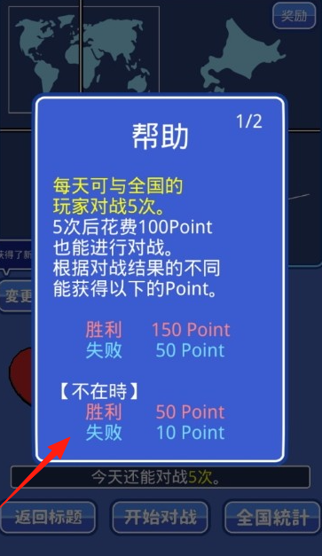 3、對戰(zhàn)規(guī)則每日可對5次,5次后需100Point繼續(xù),勝利失敗獲不同積分(勝利150不在時勝利50等),可全國對戰(zhàn)。