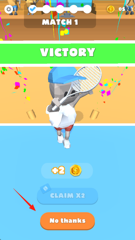 3、勝利結(jié)算獲勝顯示“VICTORY”,獲金幣(+2),可選擇“CLAIMX2(雙倍領(lǐng)?。被颉癗othanks(跳過(guò))”,進(jìn)入下一回合。