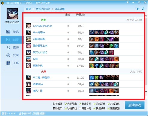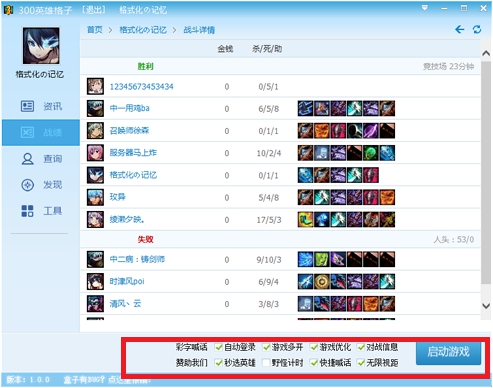 300英雄格子盒子是一款由格子工坊制作的一款300英雄助手,在這里有著戰(zhàn)績查詢、游戲精彩視頻觀看、無限視距等實(shí)用游戲功能,是您游戲的最佳幫手。