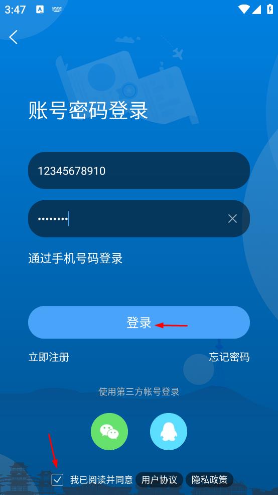 4、勾選“我已閱讀并同意用戶協(xié)議、隱私政策”,點擊“登錄”按鈕,完成登錄操作。
