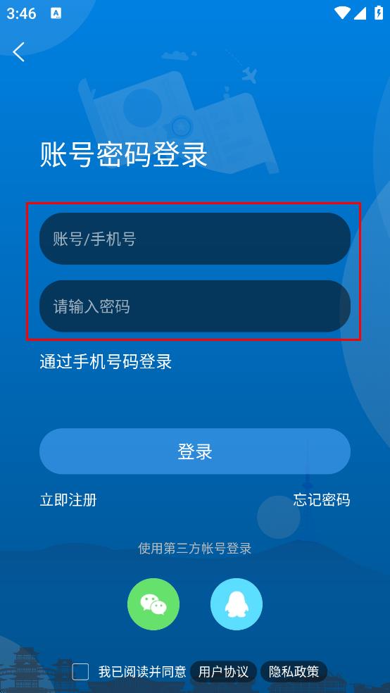 3、在賬號密碼登錄頁面,輸入賬號/手機號和密碼。