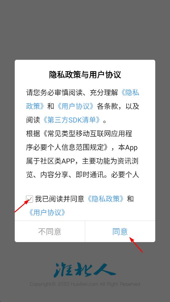 1、打開淮北人App,在隱私政策與用戶協(xié)議頁面,勾選同意協(xié)議,點擊“同意”按鈕。