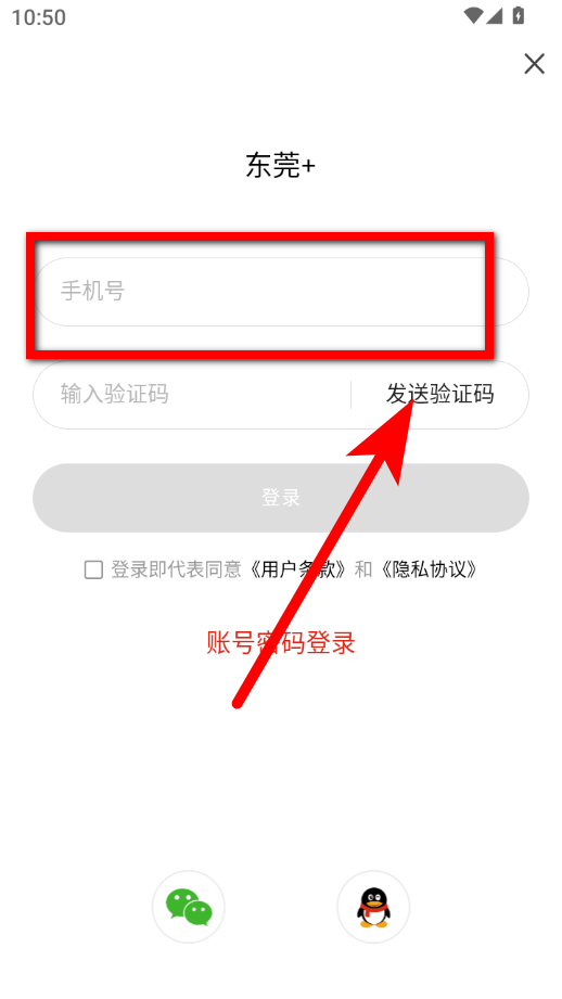 3、在登錄注冊(cè)界面,輸入手機(jī)號(hào)后點(diǎn)擊發(fā)送驗(yàn)證碼。