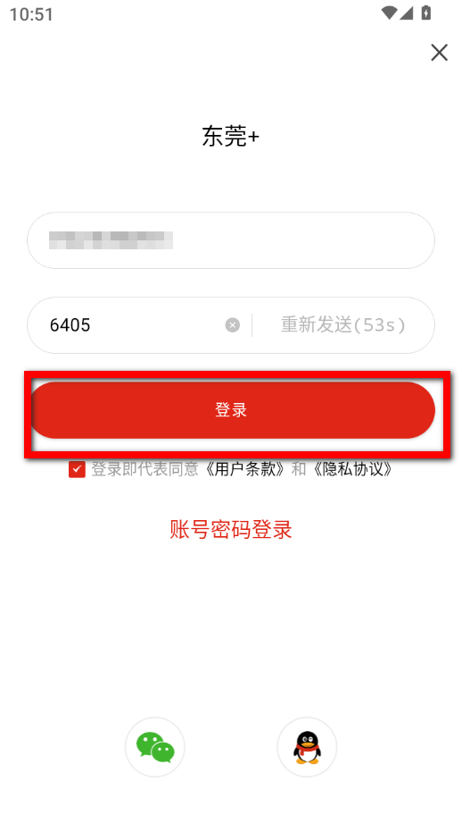 4、輸入收到的驗(yàn)證碼點(diǎn)擊登錄按鈕,完成東莞新聞app賬號(hào)注冊(cè)操作。
