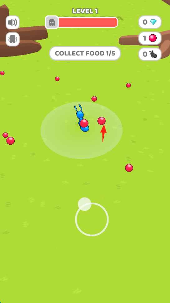 1、資源收集操控藍(lán)色螞蟻,在草地地圖撿紅色食物(“COLLECTFOOD0/5”),完成收集目標(biāo)。