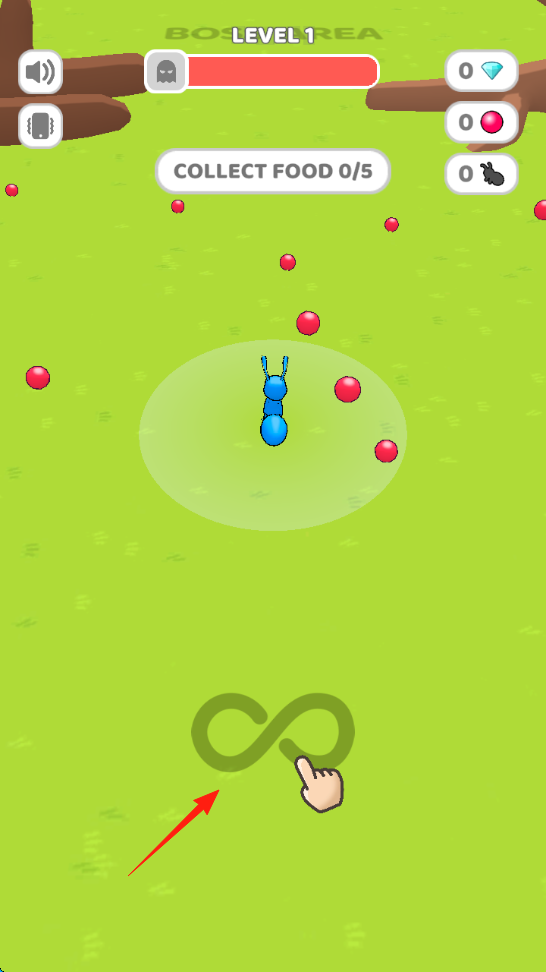 2、成長(zhǎng)升級(jí)積累食物(5個(gè)),解鎖“FIGHTBOSS”階段,獲取道具(鉆石、黑兔)強(qiáng)化螞蟻。