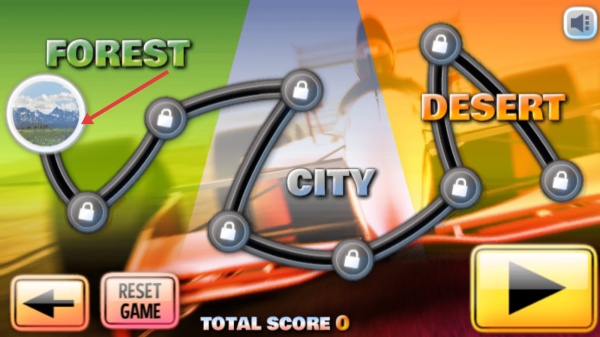 2、在賽道選擇界面,優(yōu)先選已解鎖的【FOREST】森林賽道,點(diǎn)擊【黃色播放鍵】開始比賽。