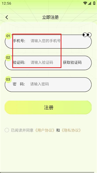 2、進(jìn)入立即注冊(cè)頁(yè)面后,輸入手機(jī)號(hào)和驗(yàn)證碼。