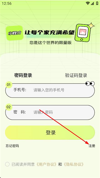 1、打開(kāi)小怪才app,在登錄頁(yè)面點(diǎn)擊注冊(cè)按鈕。