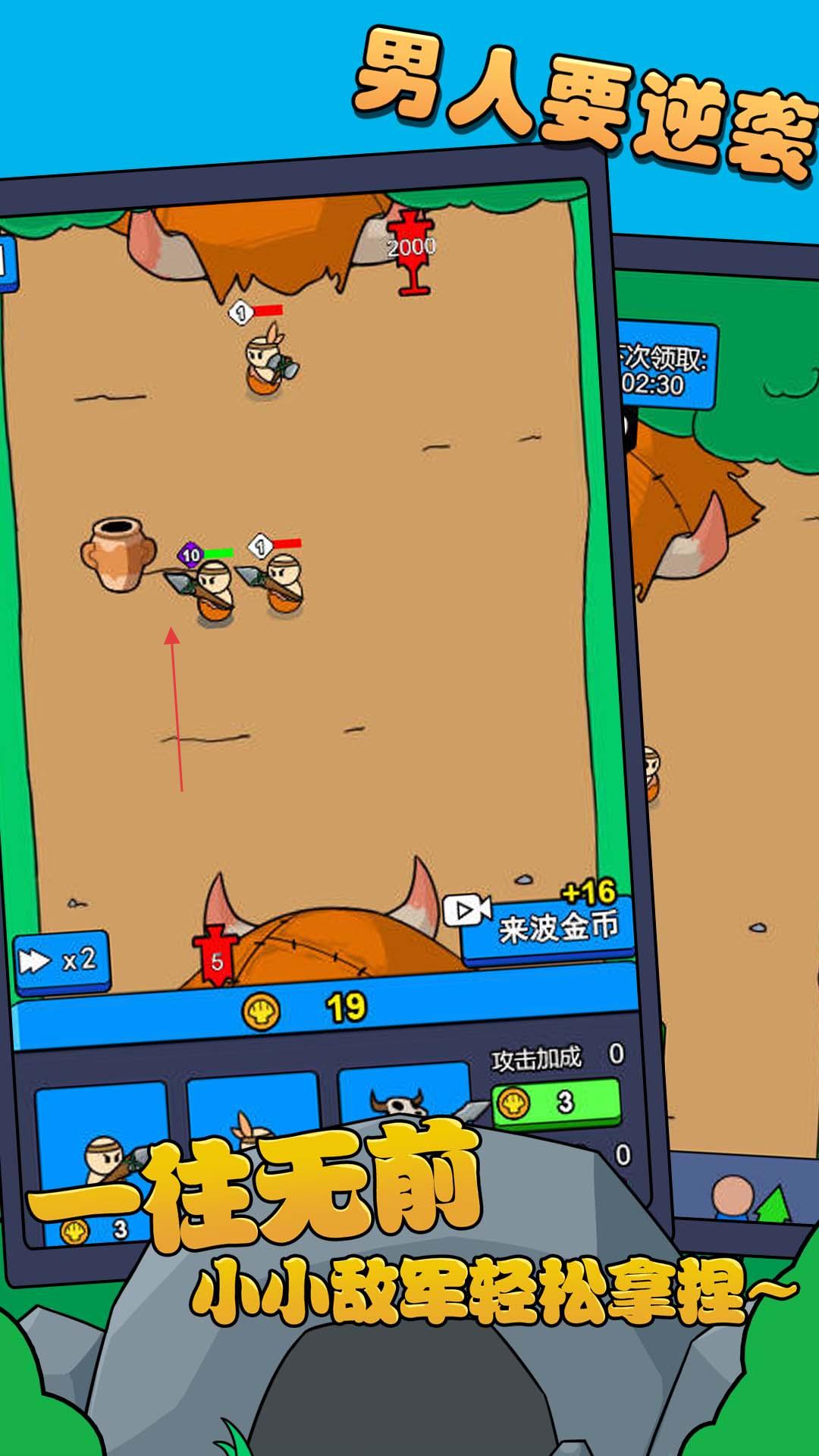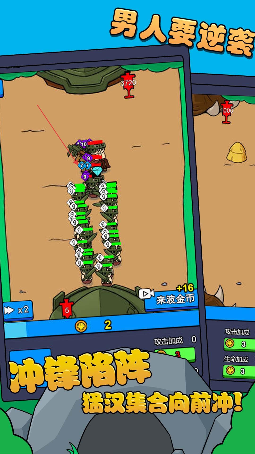 1、操控由多個(gè)小兵組成的兵團(tuán),點(diǎn)擊屏幕指揮其向敵方陣地沖鋒,利用數(shù)量?jī)?yōu)勢(shì)突破防線,推進(jìn)關(guān)卡。