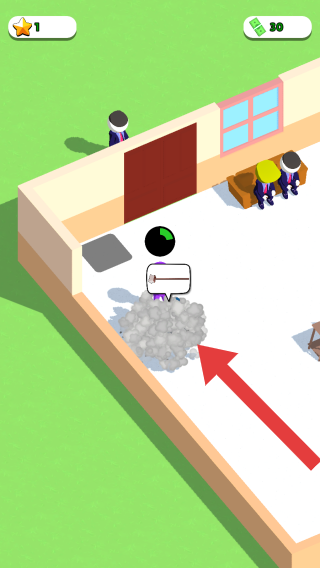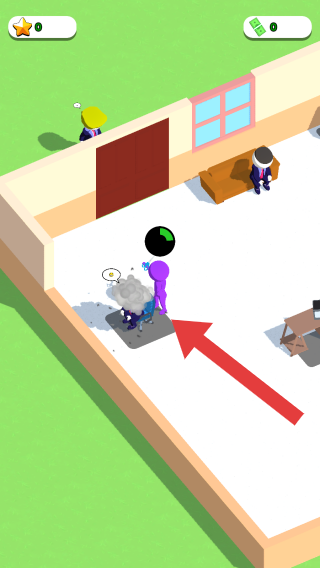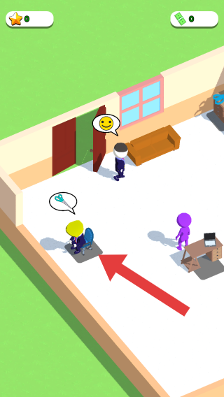 1、畫面中有三個不同顏色(黃、紫、深色)的人形角色,黃色角色坐在帶工具圖標的位置,紫色角色在桌旁,深色角色在門口。