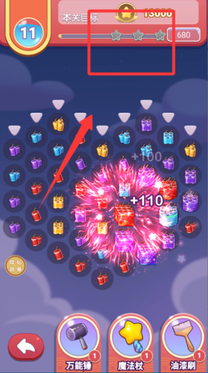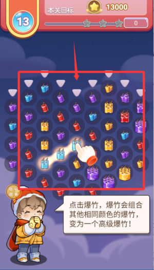1、進(jìn)入關(guān)卡后先觀察煙花布局,找到相同顏色且相鄰的圖案進(jìn)行連接消除。連續(xù)消除越多得分越高,還能觸發(fā)炫麗的煙花特效。