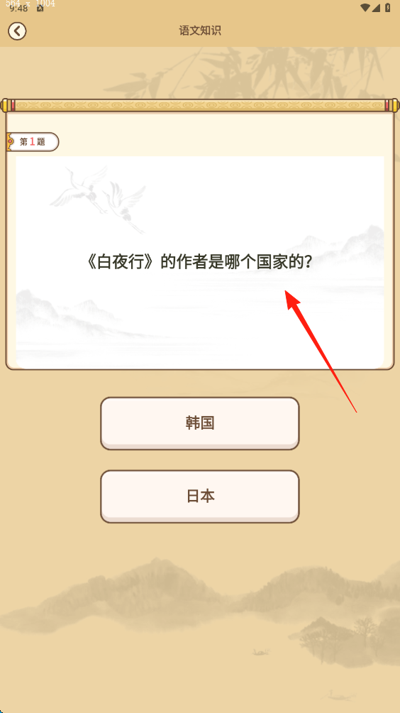 2、進入語文知識答題,看《白夜行》作者問題,回憶知識,點擊對應(yīng)國家選項。