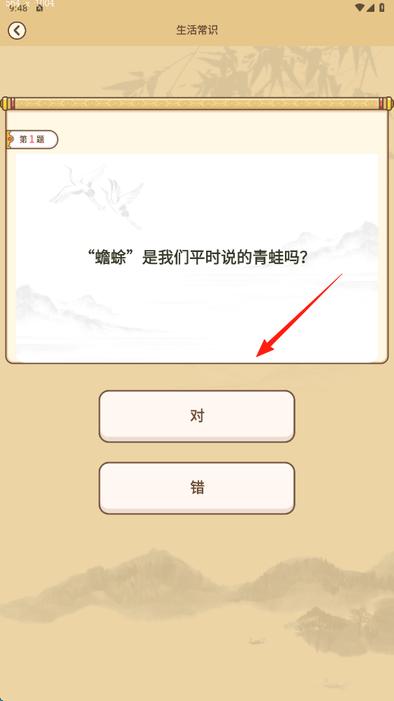 3、生活常識答題中,遇蟾蜍是否為青蛙問題,判斷對錯,點擊答案選項作答。