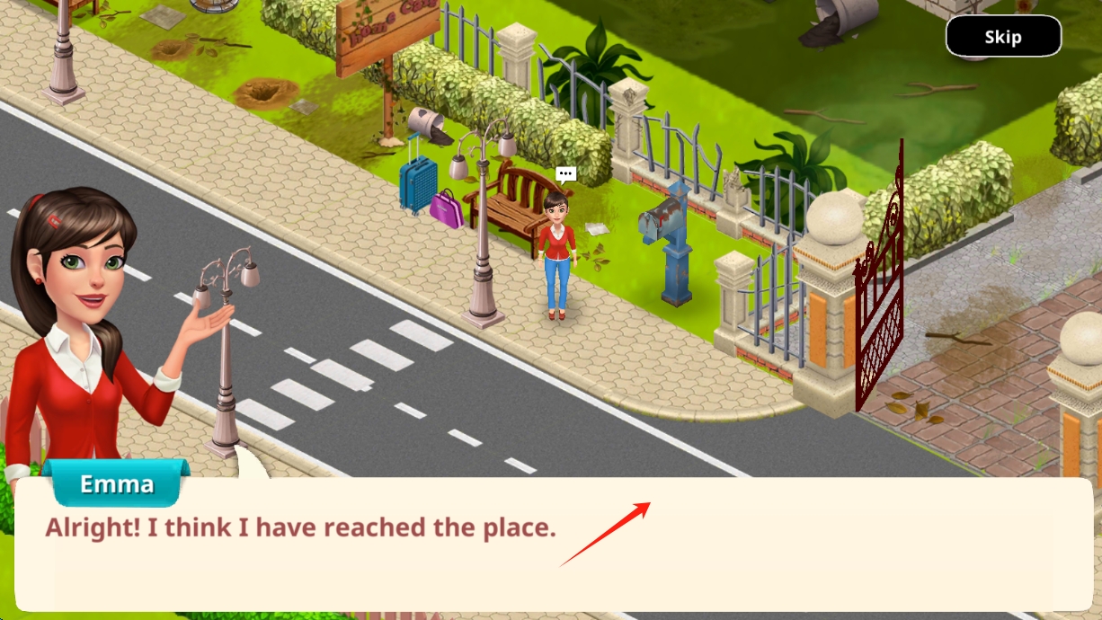 2、查看角色對話了解情境,可點(diǎn)“Skip”跳過對話,按指引探索場景目標(biāo)。
