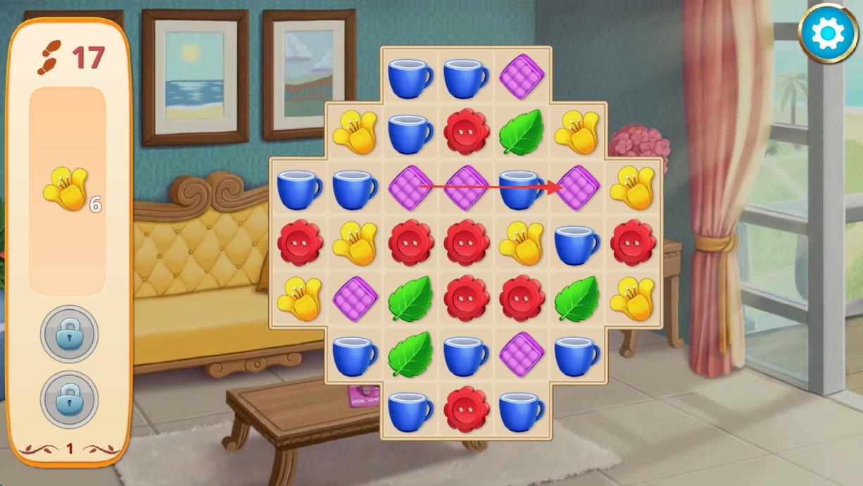 3、在消除關(guān)卡,交換相鄰元素使三個(gè)及以上同圖案相連,完成消除任務(wù)。