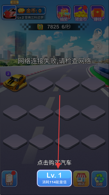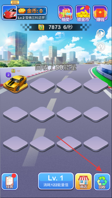 3、當(dāng)能量值不足時(shí),點(diǎn)擊右下角【回收】按鈕,回收能量,補(bǔ)充能量以繼續(xù)購(gòu)買或升級(jí)汽車,推進(jìn)游戲進(jìn)程。
