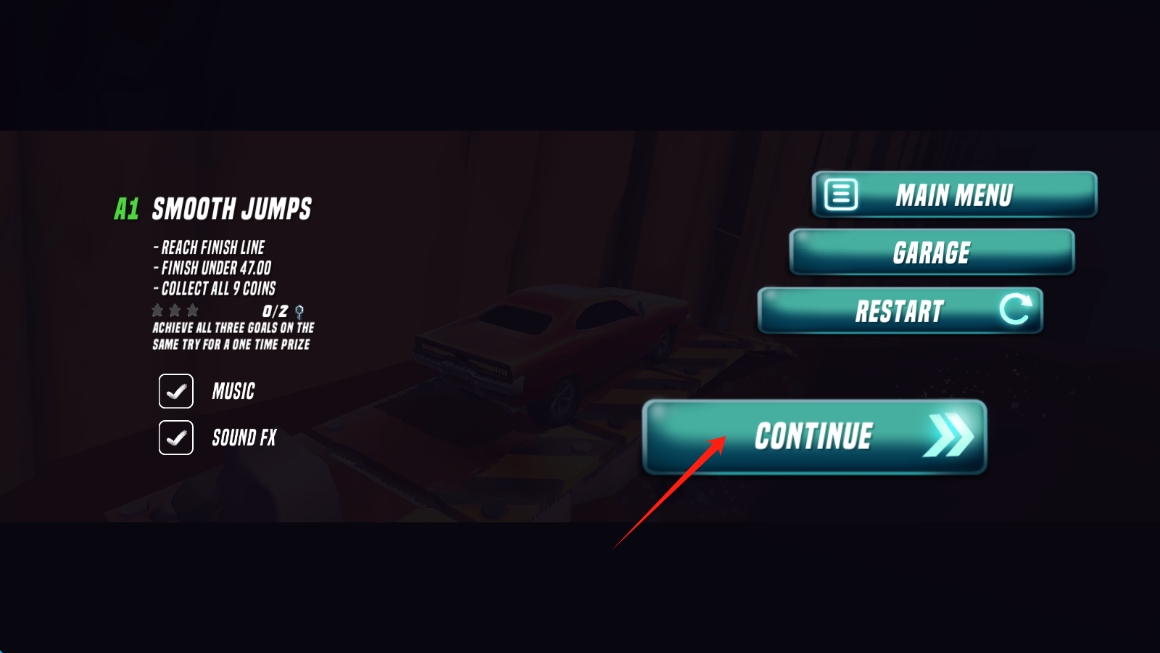 1、點擊繼續(xù)游戲,利用連續(xù)成功動作觸發(fā)"雙倍積分"狀態(tài),通過回放功能分析改進駕駛路線。